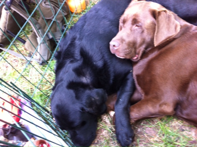 ……mina trötta hundar sökte trygghet hos varandra, här i Elverum där det också var jakt- och fiskemässa.